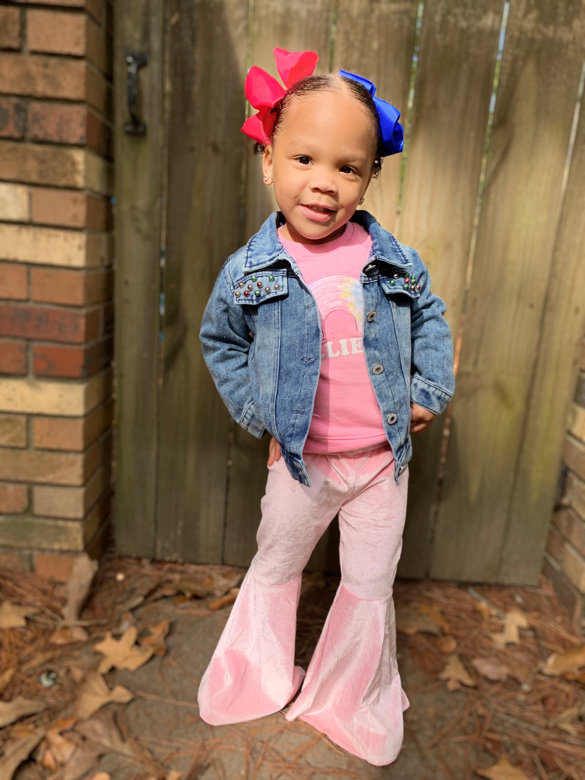 Model is wearing (S) 2-3t. Denim Jacket and Hair bows sold separately
